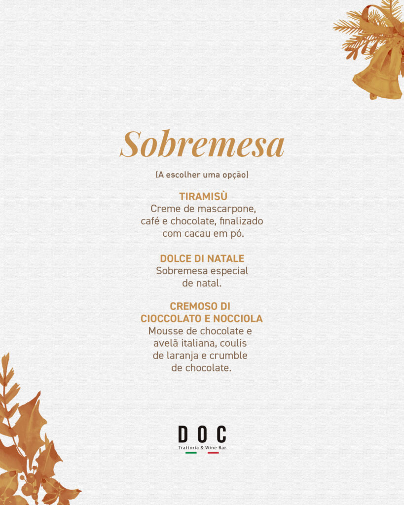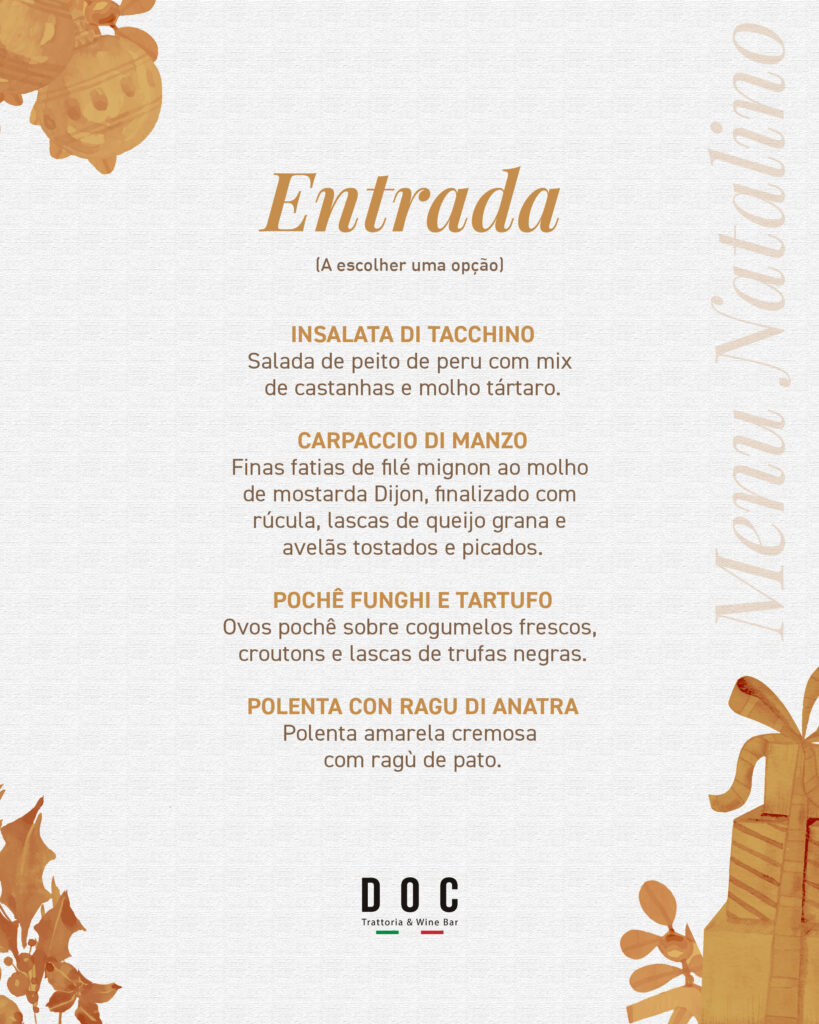 As vagas são limitadas e as reservas antecipadas são essenciais para garantir participação na Ceia de Natal do DOC Trattoria & Wine Bar.