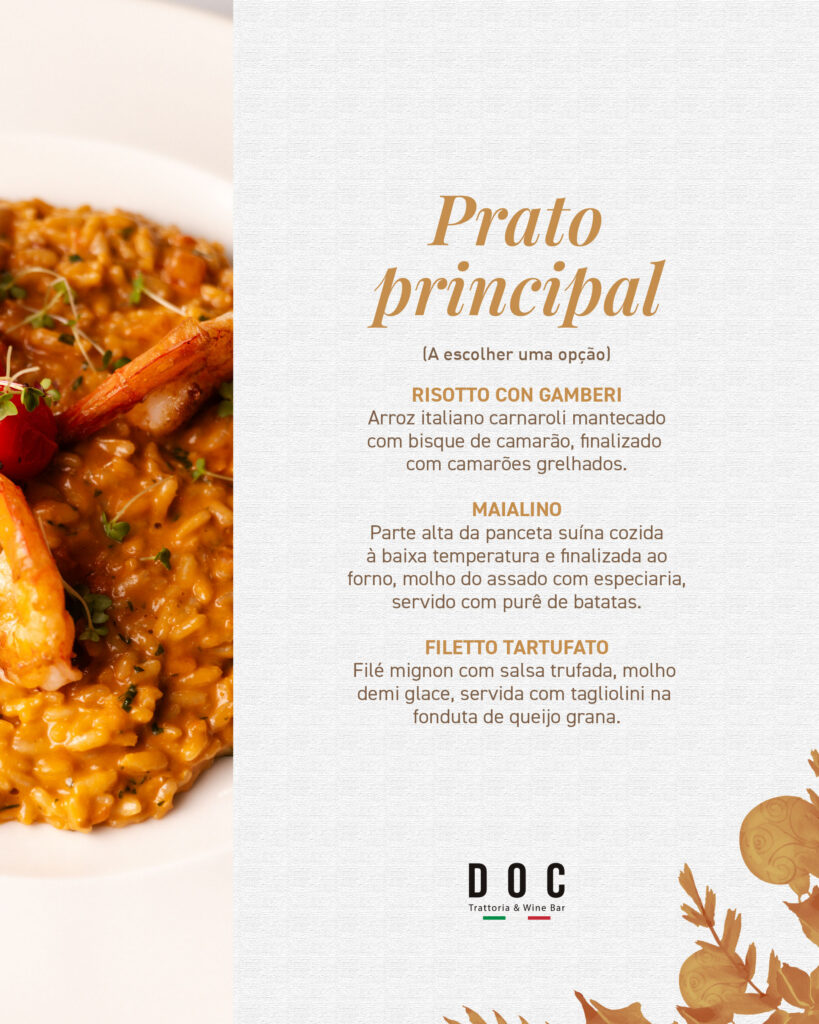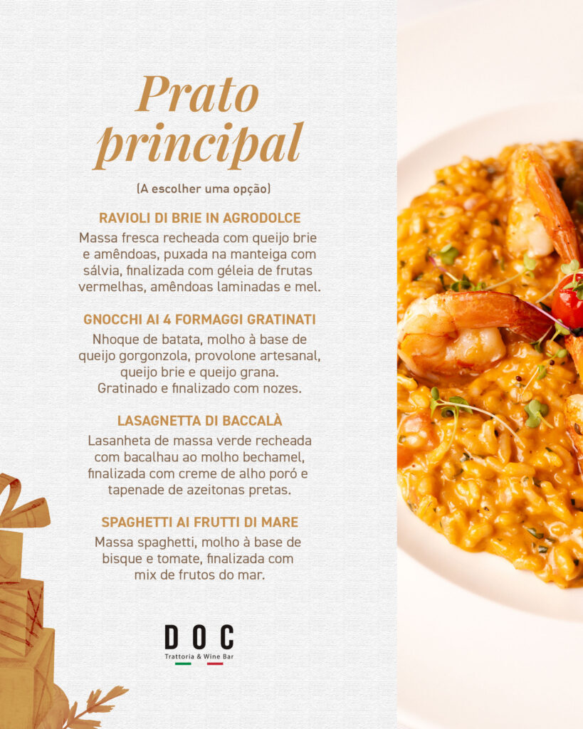Para a véspera de Natal, o DOC apresenta um menu fechado e exclusivo, servido apenas no dia 24 de dezembro, composto por entrada, prato principal e sobremesa, desenvolvidos especialmente para a ocasião.